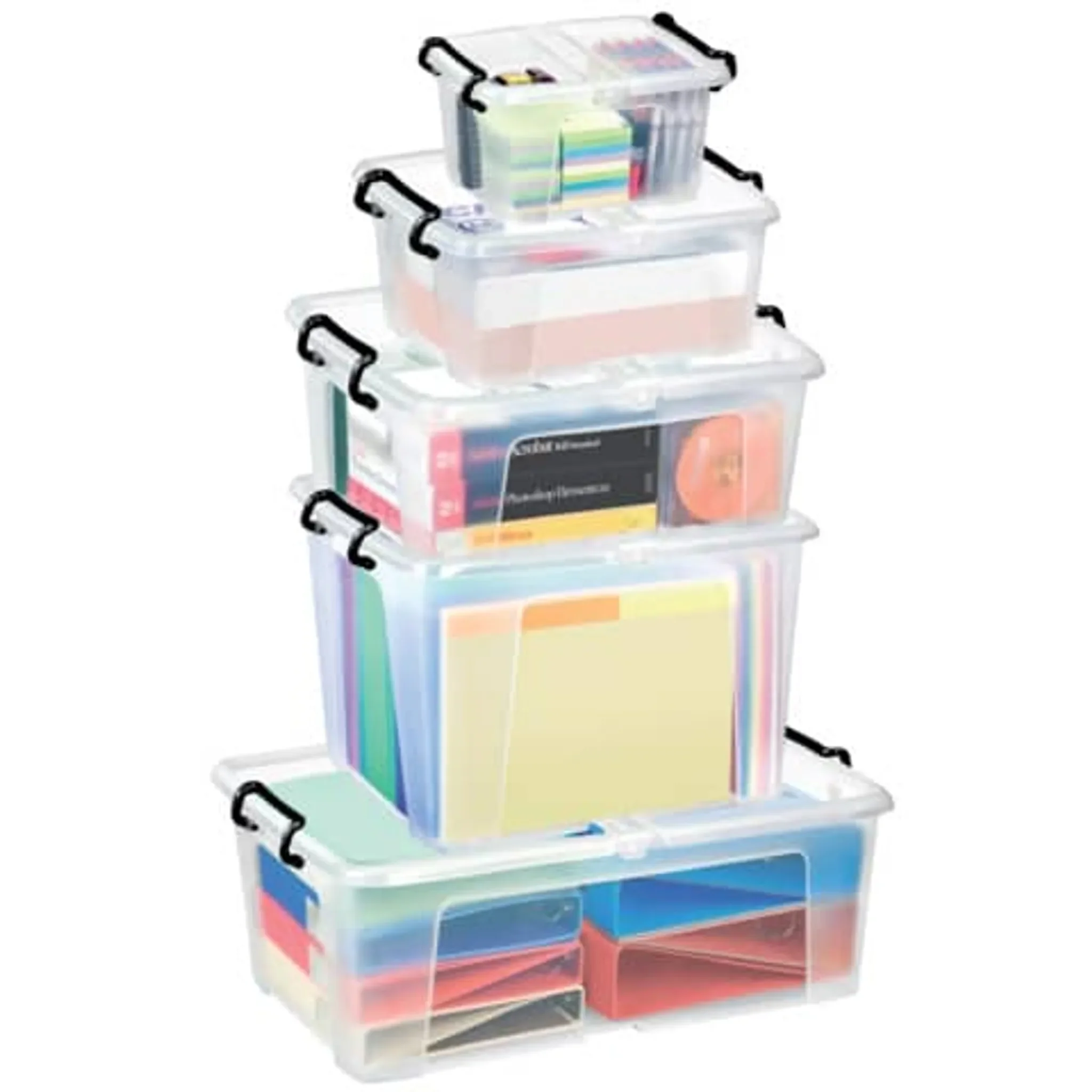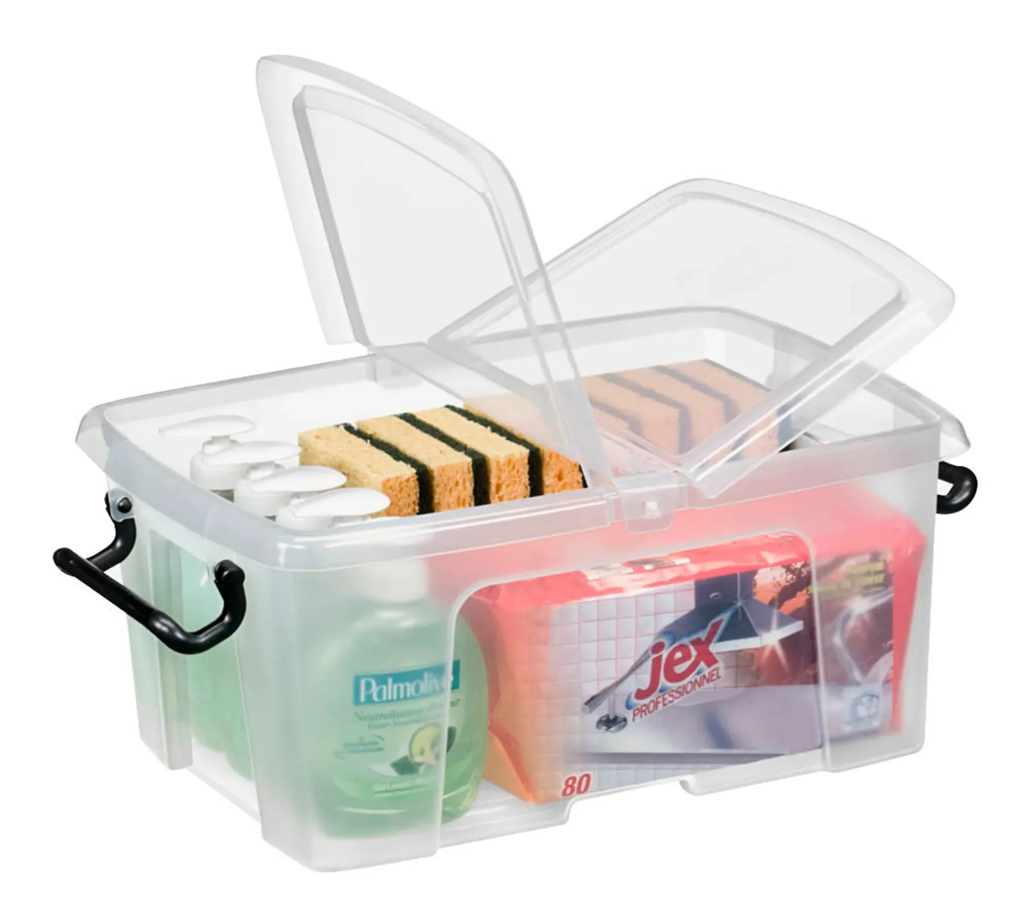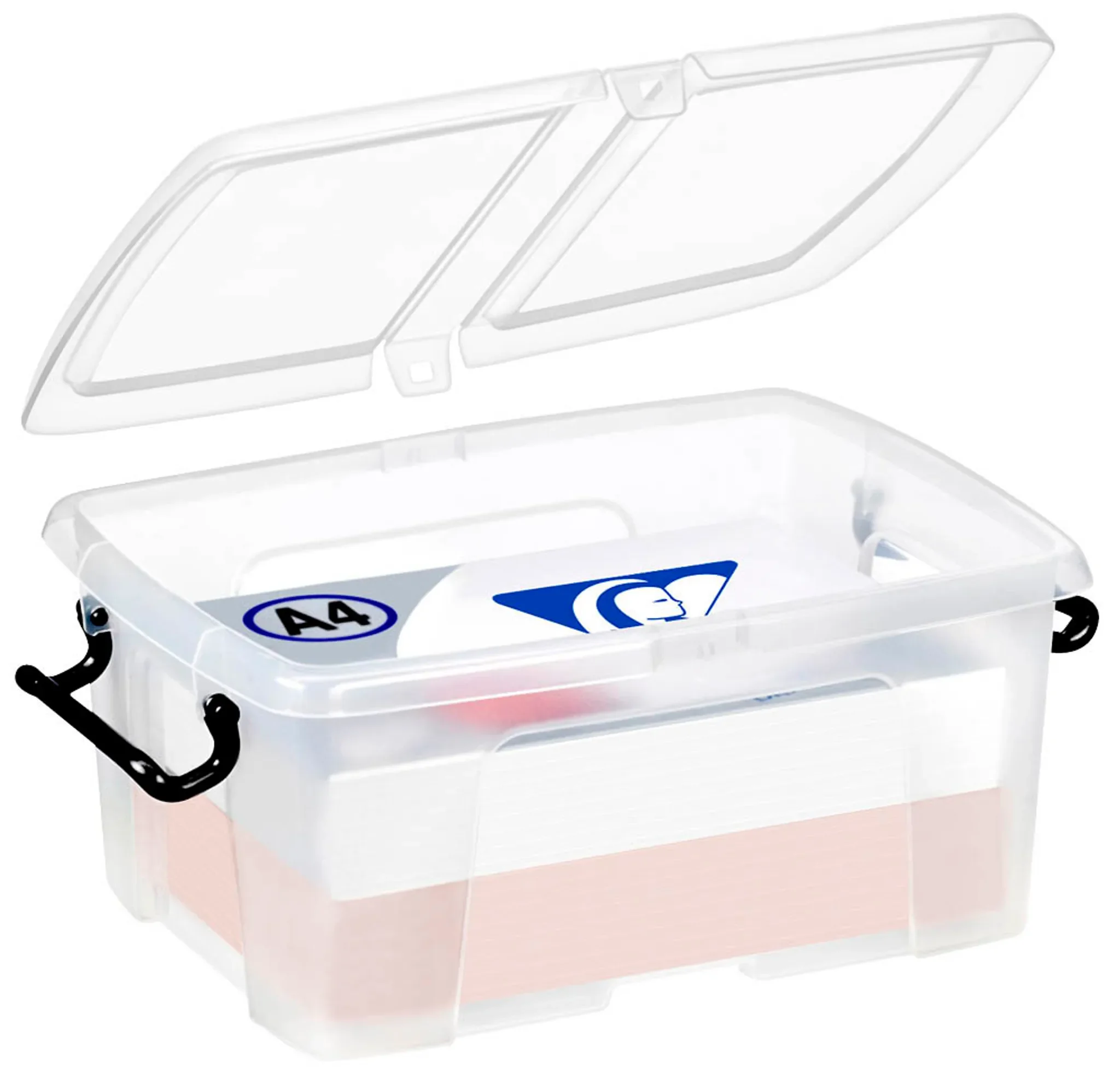 Highlights: Robuste, transparente Aufbewahrungsbox aus PP, stapelbar, mit Doppel-Klappdeckel und seitlichen Griffen, ideal für Büro, Lager, Heim oder Kofferraum.