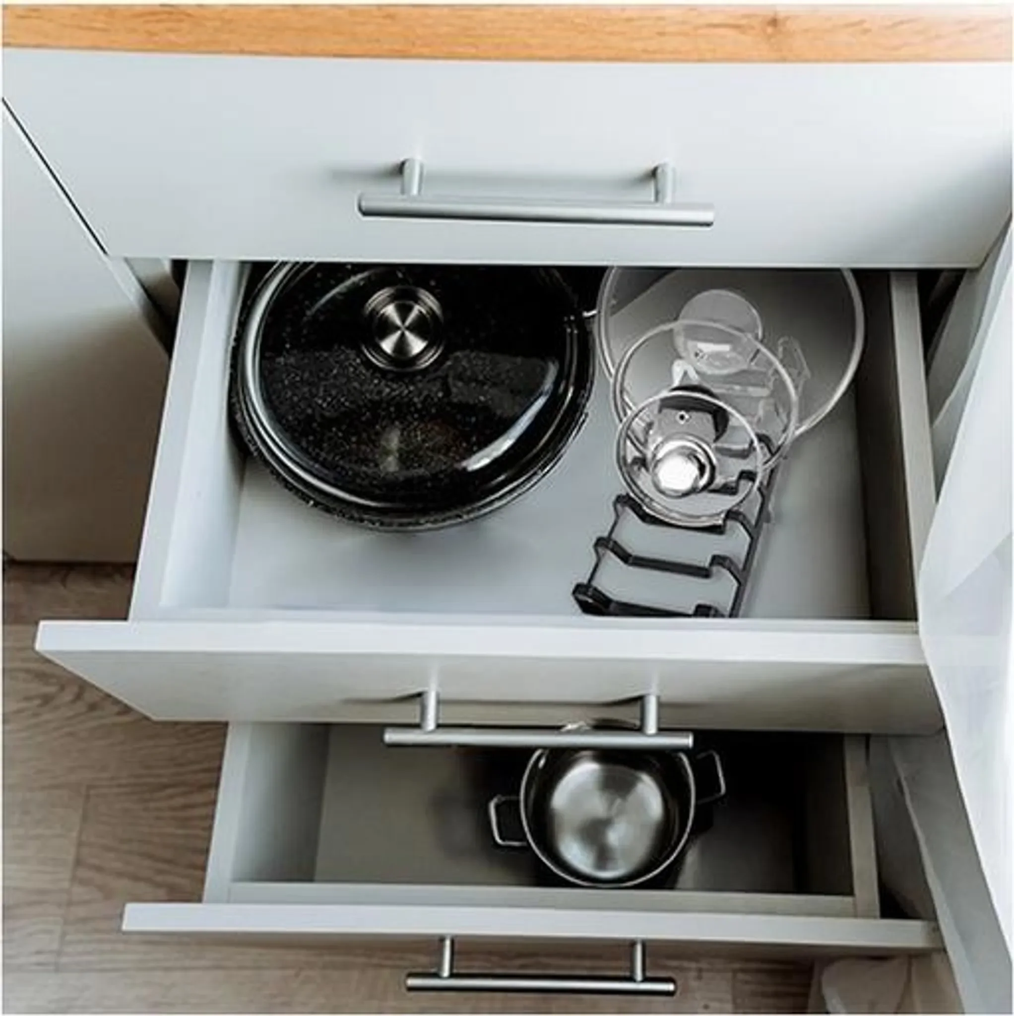 Vertikale Aufbewahrung erleichtert die Entnahme und sorgt dafür, dass Ihr Küchenzubehör stets griffbereit ist. Der Organizer kann in Schränken, Schubladen oder auf Tischplatten eingesetzt werden.