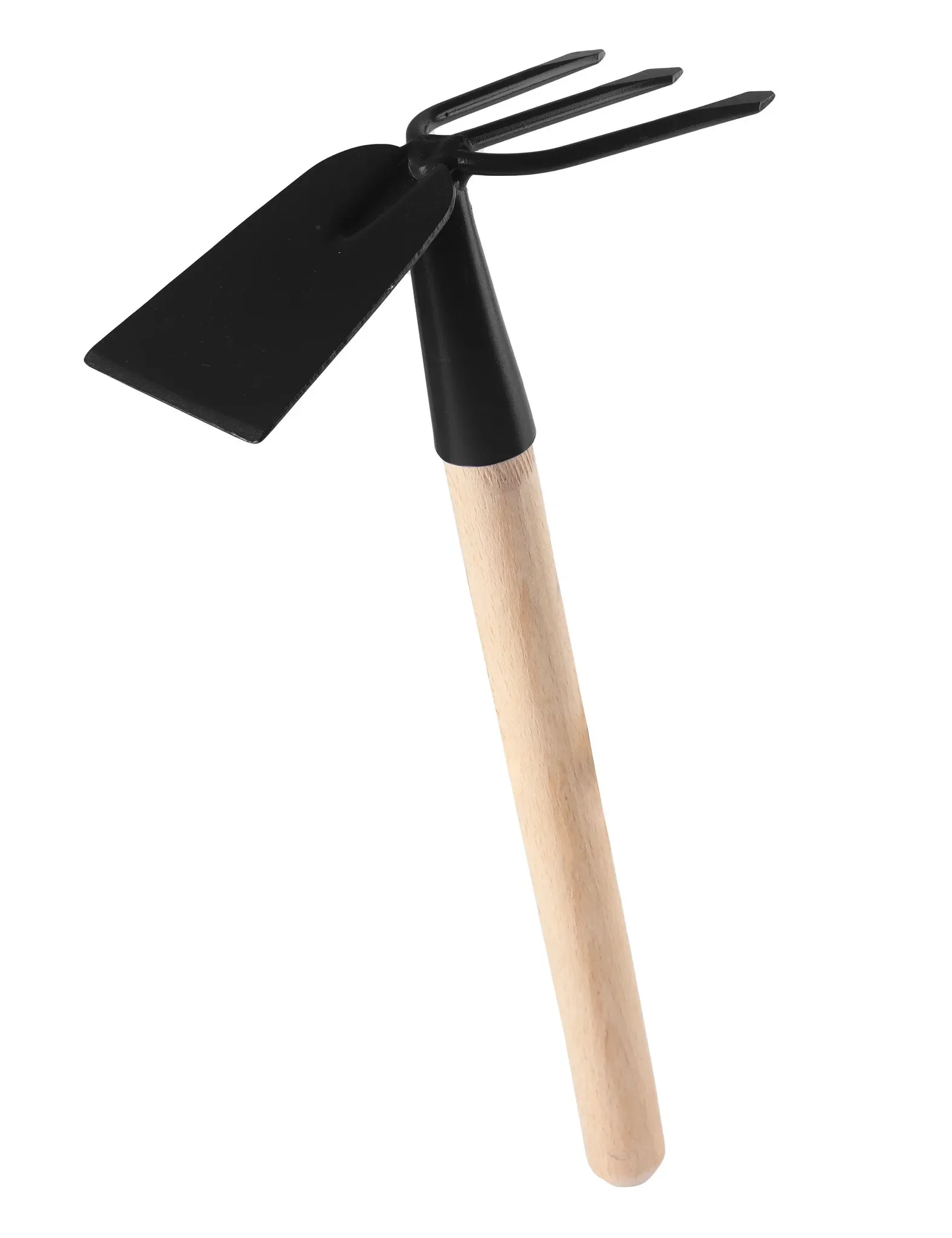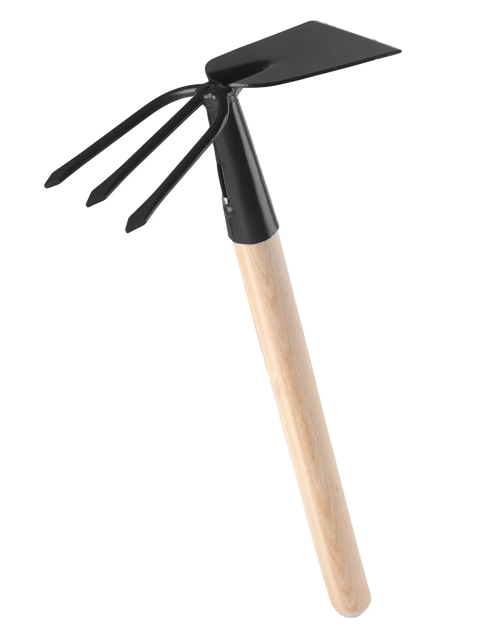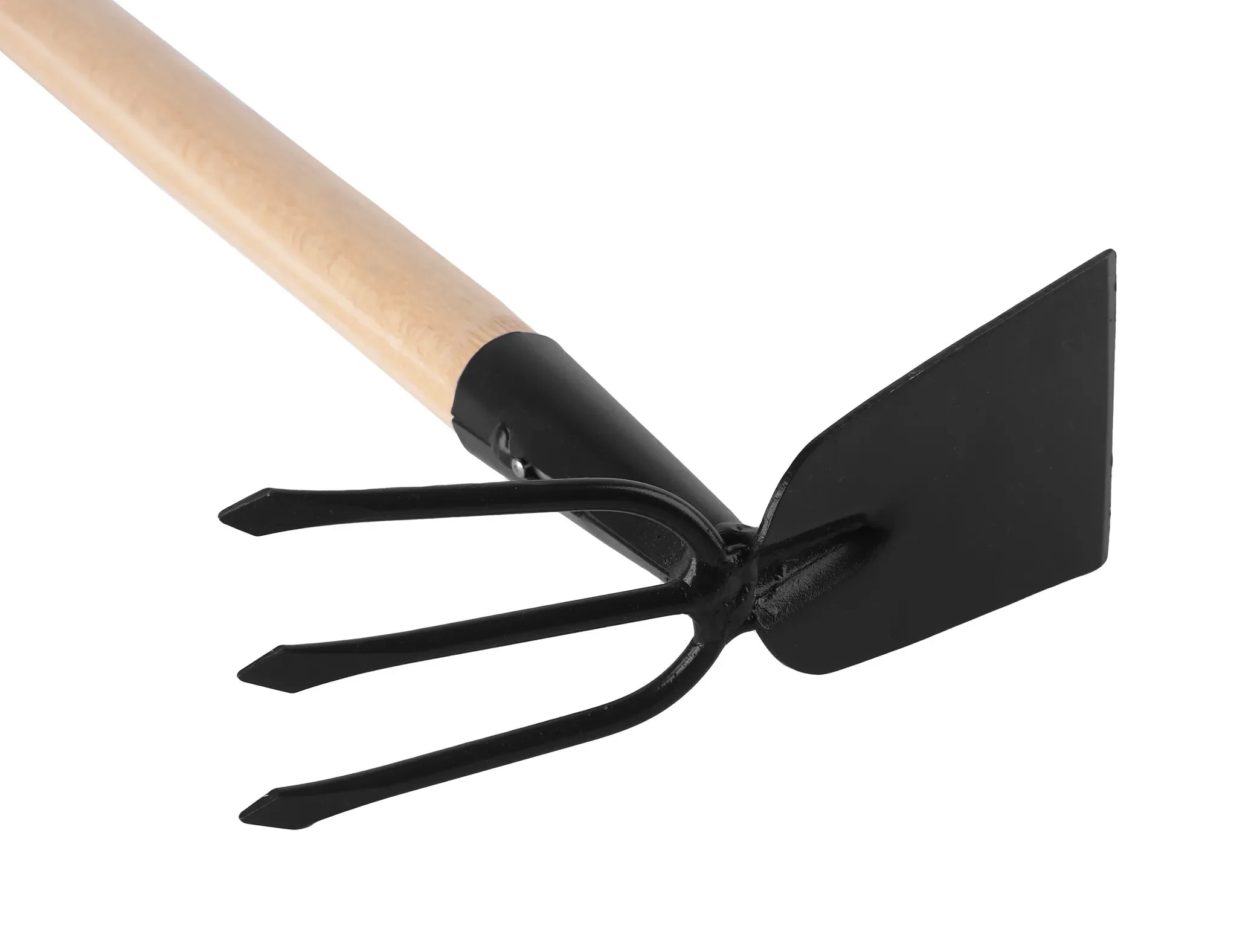 Diese kompakte Unkrauthacke kombiniert eine gespitze Hacke mit einer praktischen Harke und eignet sich ideal für vielfältige Gartenarbeiten. Auf der einen Seite befinden sich drei stabile Metallzinken, auf der anderen ein rechteckiges Hackblatt mit abgespitztem Vorderrand.